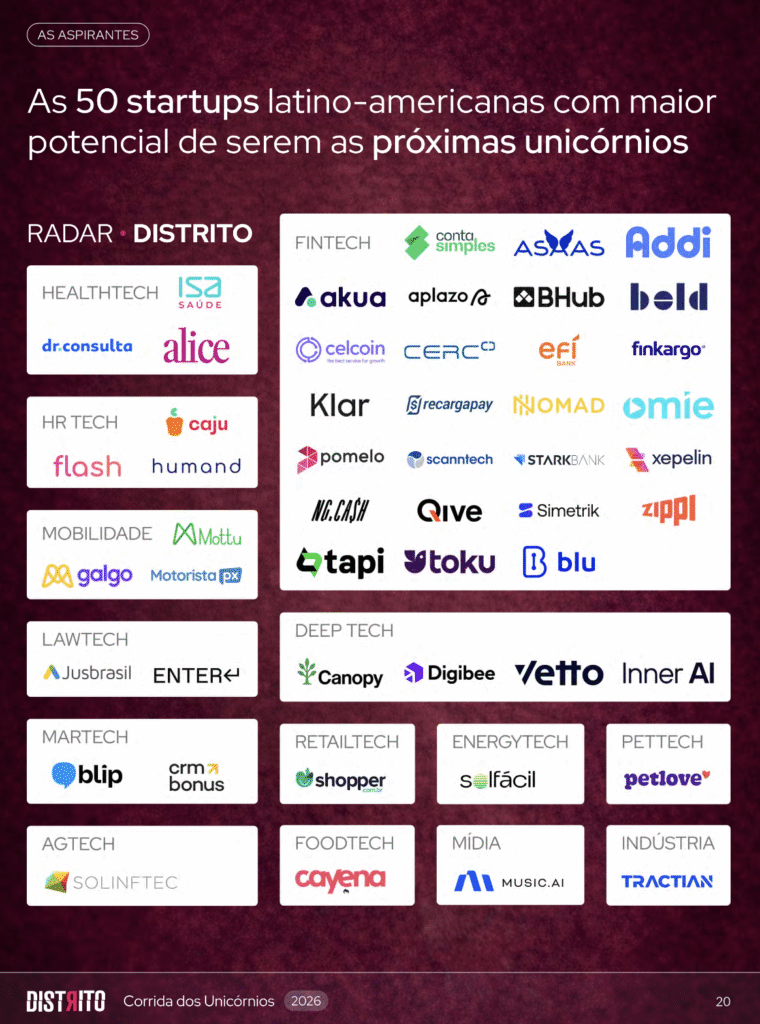 Entre as 50 empresas mapeadas, há predominância de fintechs, plataformas SaaS e soluções B2B, além de modelos fortemente baseados em tecnologia e dados.