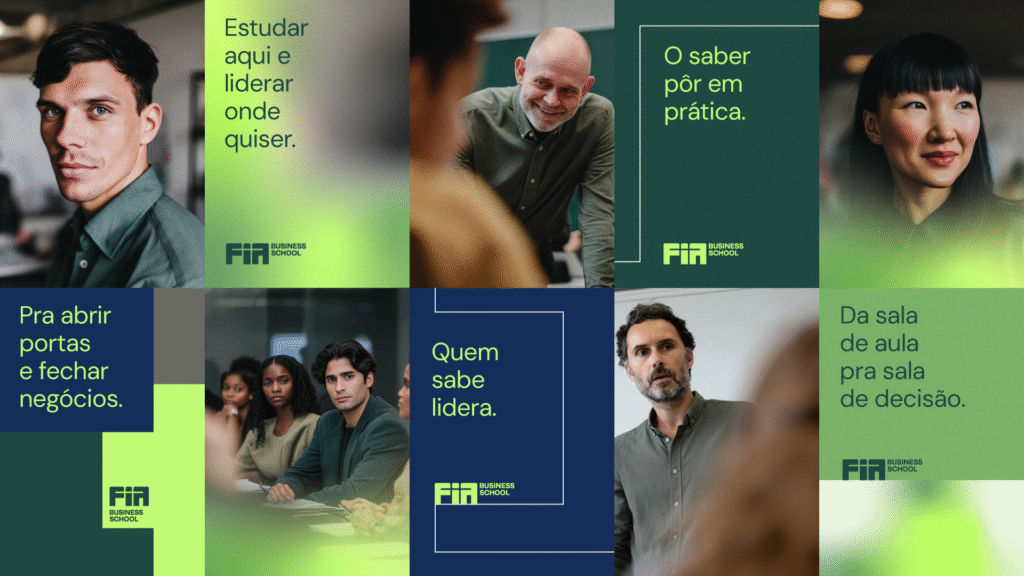 A anacouto atuou desde a organização do portfólio até o desenho da experiência de marca, criando uma estrutura que reforça a essência da escola em todos os pontos de contato. O novo logotipo faz referência ao legado da instituição ao mesmo tempo em que une as letras de “FIA” por um fio condutor que simboliza a integração entre teoria e prática. A paleta de tons de verde amplia as possibilidades de aplicação, e o protagonismo humano aparece de forma destacada nos materiais visuais. No campo verbal, a identidade adota linguagem direta e orientada ao impacto, com expressões que reforçam a aplicabilidade do conhecimento, como “Estudar aqui e liderar onde quiser” e “O que a gente reflete em sala vai pro mundo”.