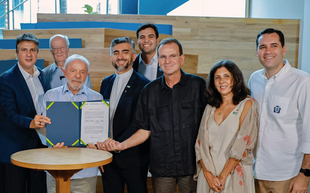 O presidente Lula esteve presente à assinatura da portaria do MEC; na foto, entre o reitor da PUC-Rio e o ministro Camilo Santana – Foto: Alan Costa/Secretaria Municipal de Educação do Rio de Janeiro