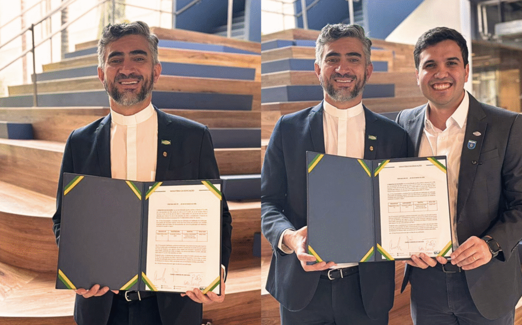 Pe. Anderson e Ferreirinha exibem o documento com a autorização da abertura do curso de Medicina – Foto: divulgação